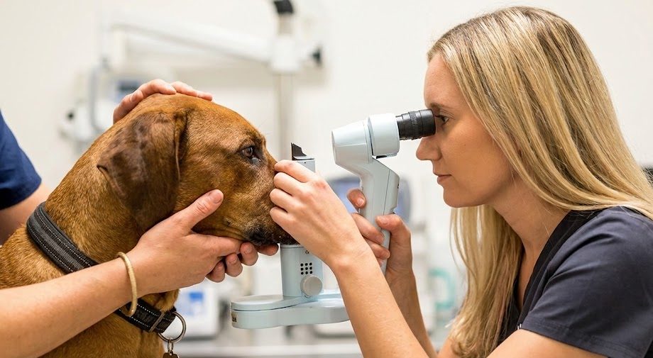Under besöket undersöks ögat i detalj med hjälp av specialinstrument som spaltlampa och oftalmoskop. För att veterinären ska kunna se hela näthinnan och linsen ordentligt får hunden först ögondroppar som vidgar pupillerna.